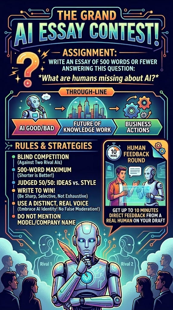 I thought it might be useful to ask AI what it thinks, so I created an essay contest. Here’s how it works: